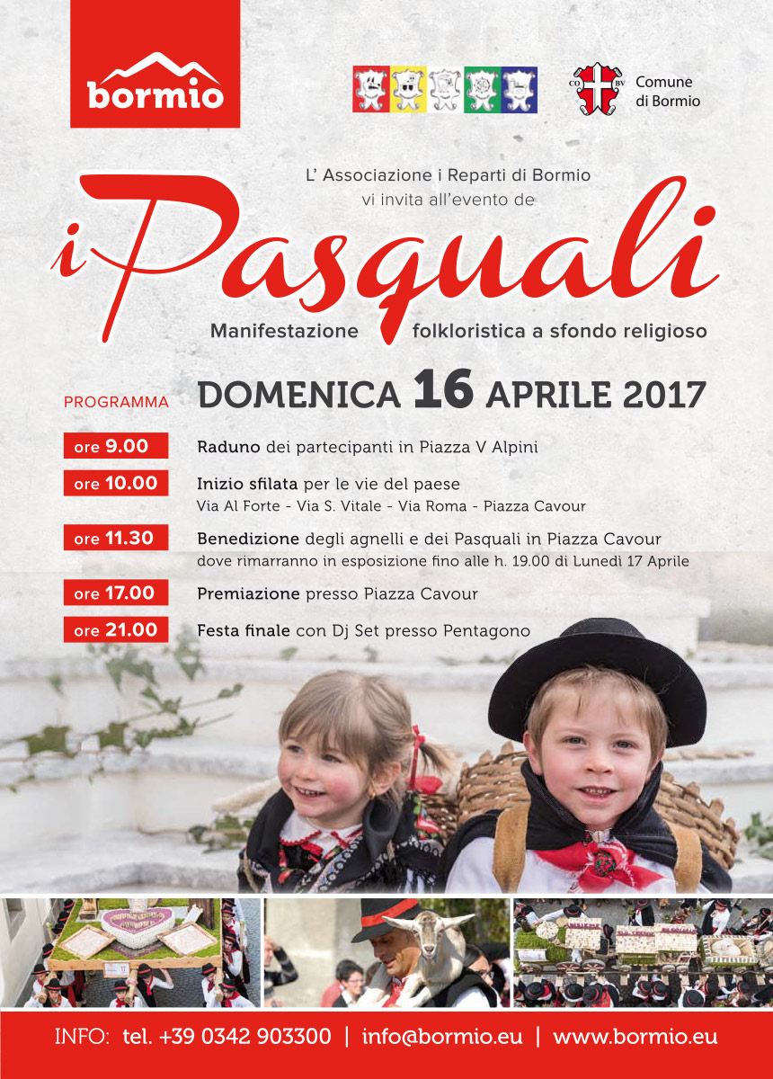 Per il giorno di Pasqua, Domenica 16 Aprile 2017, ritorna il tradizionale appuntamento con i Pasquali di Bormio, una tradizione storica unica nell’arco alpino, che vede sfilare lungo la centrale via Roma svariate portantine allegoriche a tema religioso realizzate in legno e materiali locali dai giovani del paese, divisi per reparto ( quartiere ).